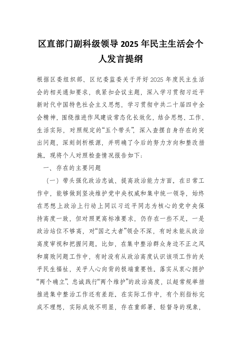 区直部门副科级领导2025年民主生活会个人发言提纲