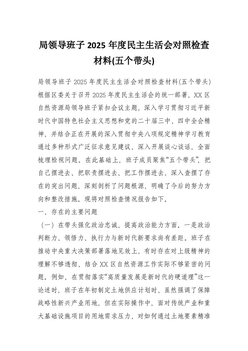 首页写作素材局领导班子2025年度民主生活会对照检查材料(五个带头)