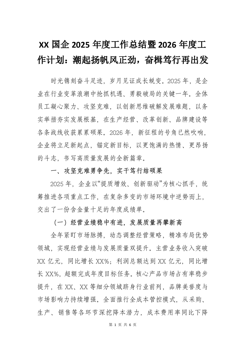 XX国企2025年度工作总结暨2026年度工作计划:潮起扬帆风正劲,奋楫笃行再出发