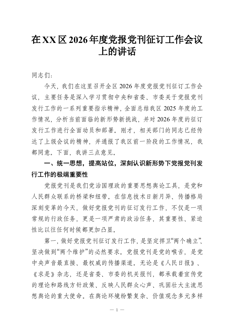 在XX区2026年度党报党刊征订工作会议上的讲话