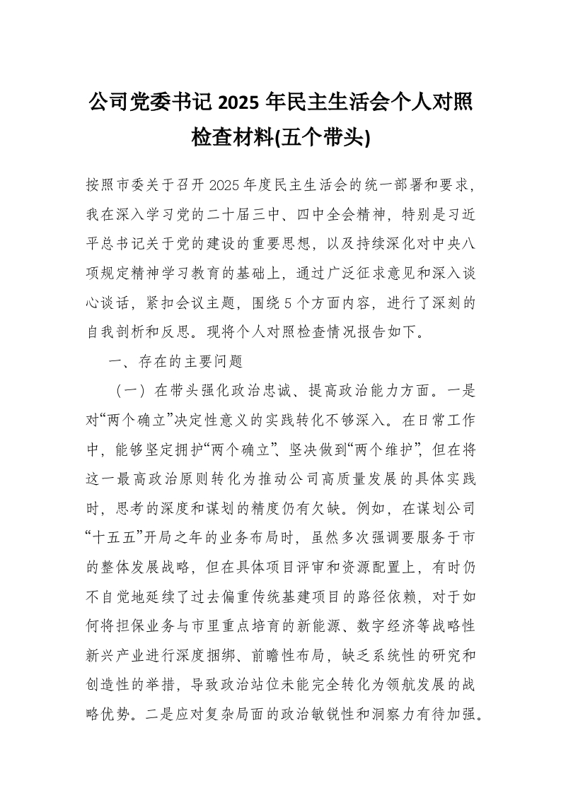 公司党委书记2025年民主生活会个人对照检查材料(五个带头)