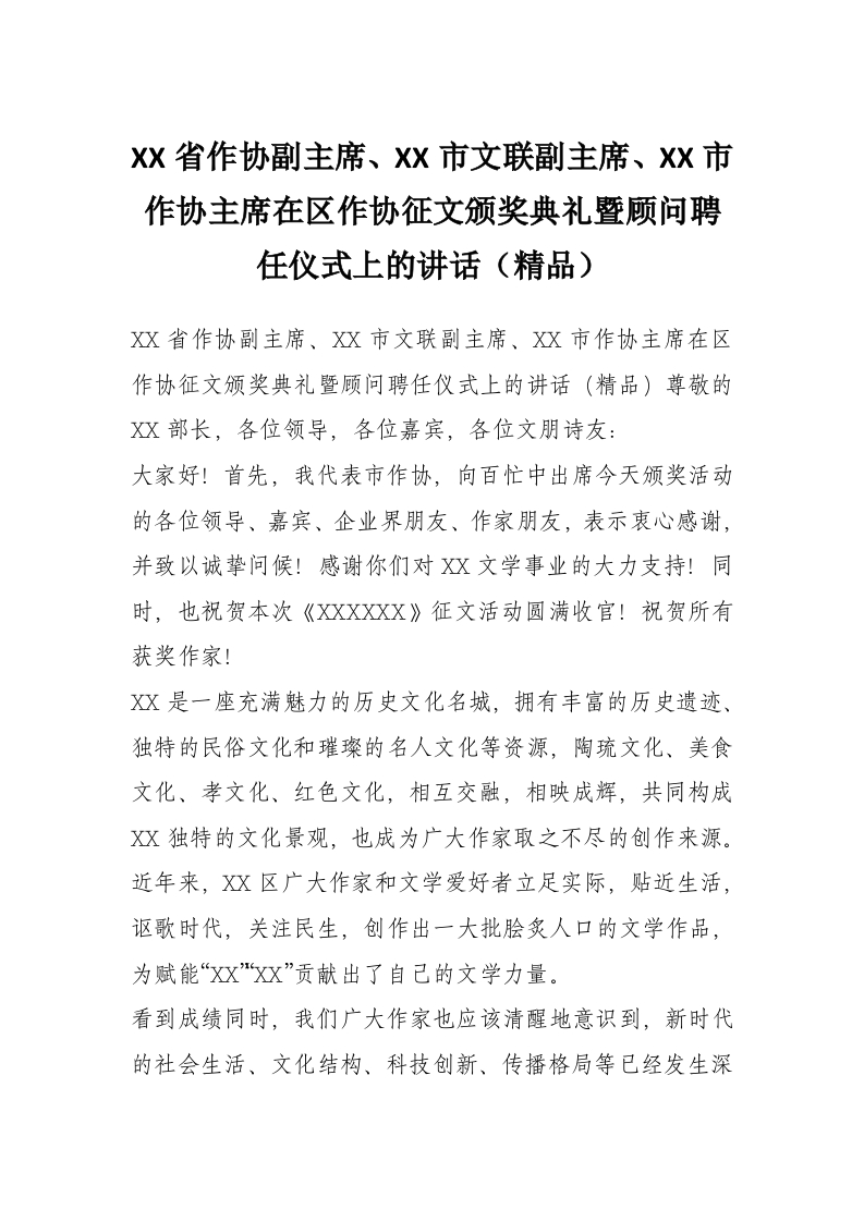 XX省作协副主席、XX市文联副主席、XX市作协主席在区作协征文颁奖典礼暨顾问聘任仪式上的讲话(精品)