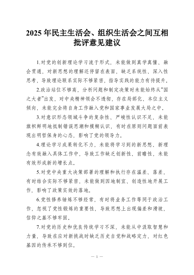 2025年民主生活会、组织生活会之间互相批评意见建议