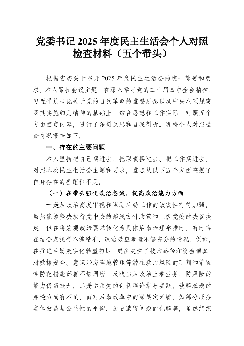 首页讲课讲稿党委书记2025年度民主生活会个人对照检查材料(五个带头)