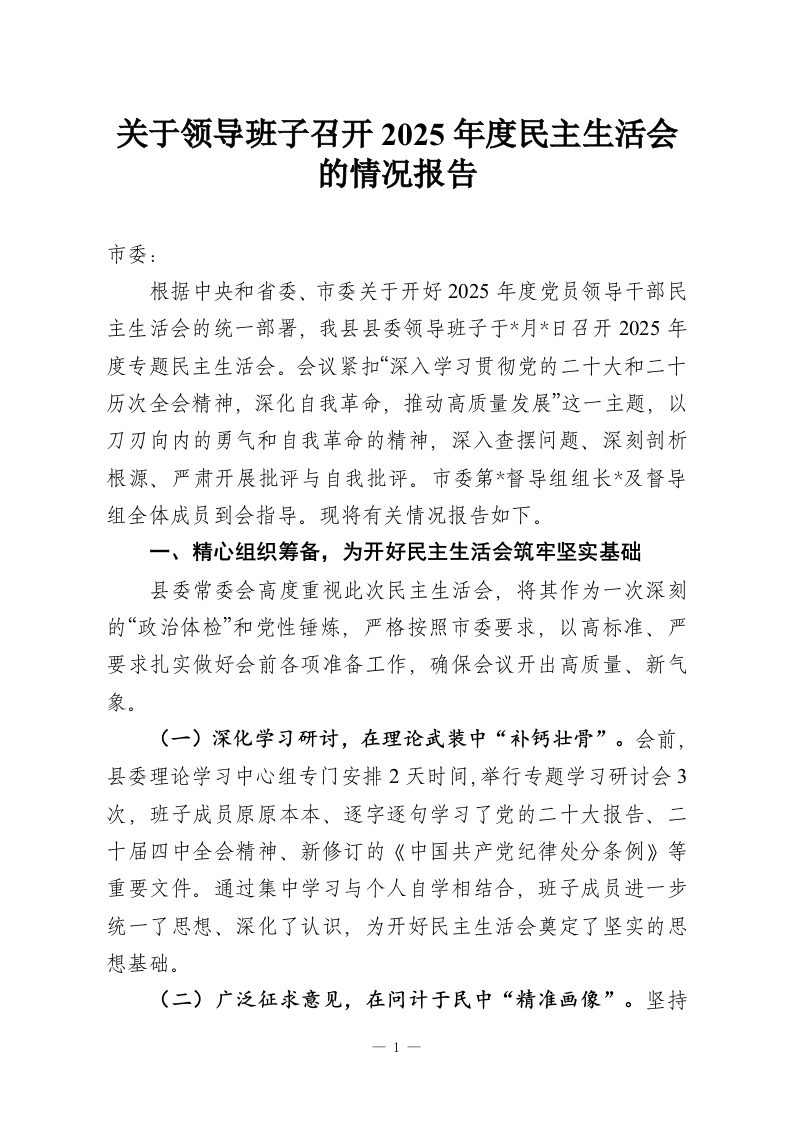 首页讲课讲稿关于领导班子召开2025年度民主生活会的情况报告