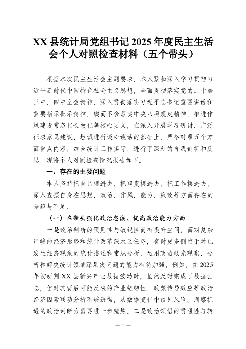 XX县统计局党组书记2025年度民主生活会个人对照检查材料(五个带头)