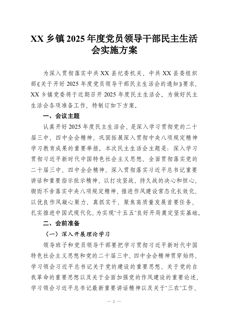 XX乡镇2025年度党员领导干部民主生活会实施方案