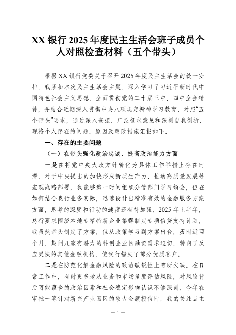 XX银行2025年度民主生活会班子成员个人对照检查材料(五个带头)