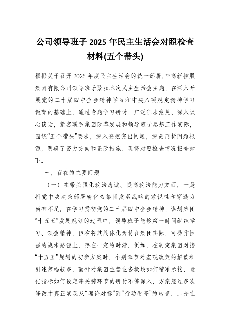 公司领导班子2025年民主生活会对照检查材料(五个带头)