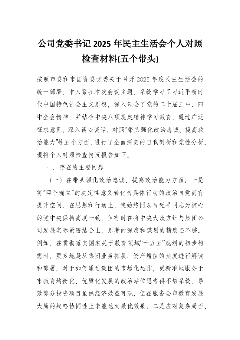 首页材料汇编公司党委书记2025年民主生活会个人对照检查材料(五个带头)