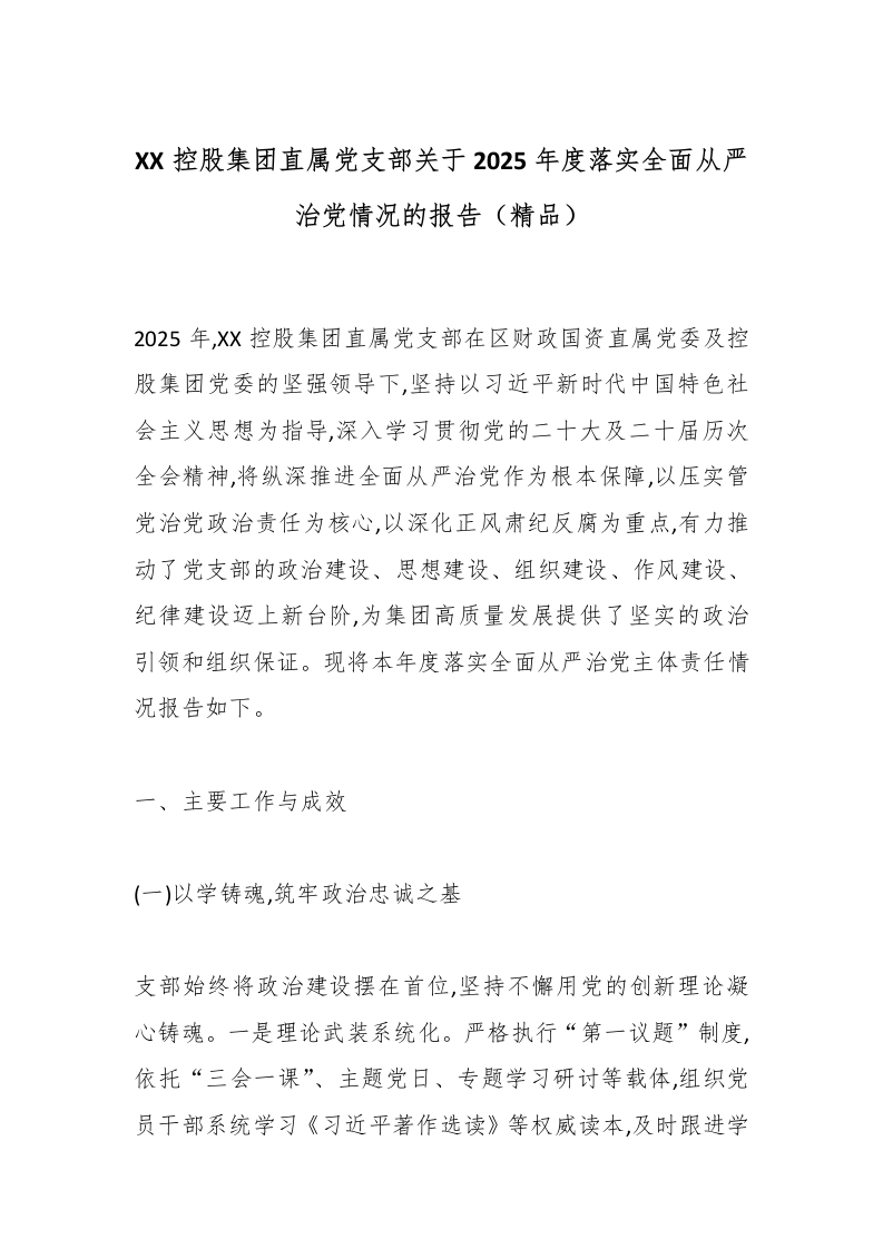 XX控股集团直属党支部关于2025年度落实全面从严治党情况的报告(精品)_副本