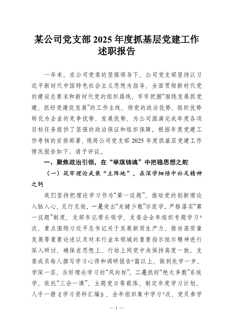 首页精选范文某公司党支部2025年度抓基层党建工作述职报告