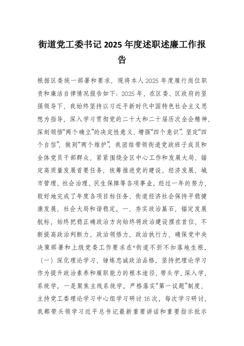 街道党工委书记2025年度述职述廉工作报告