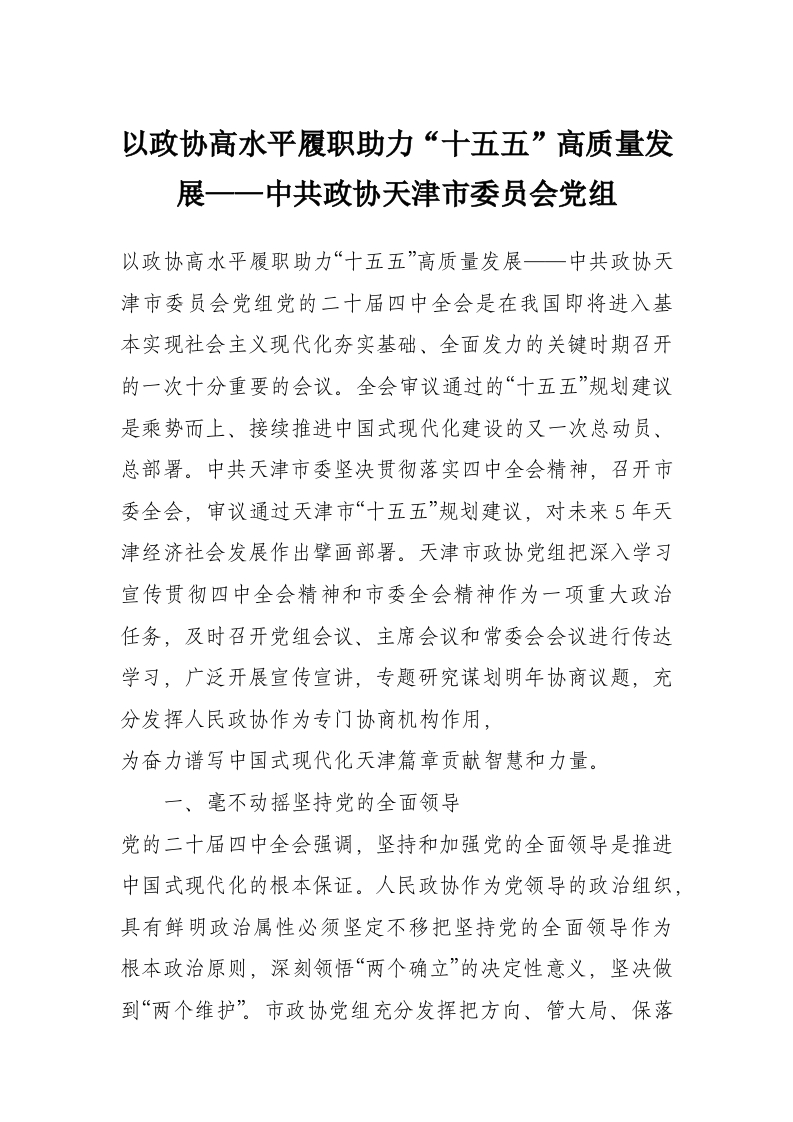 首页精选范文以政协高水平履职助力“十五五”高质量发展——中共政协天津市委员会党组