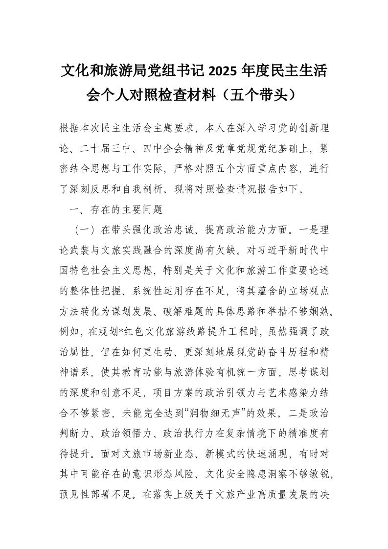 文化和旅游局党组书记2025年度民主生活会个人对照检查材料(五个带头)
