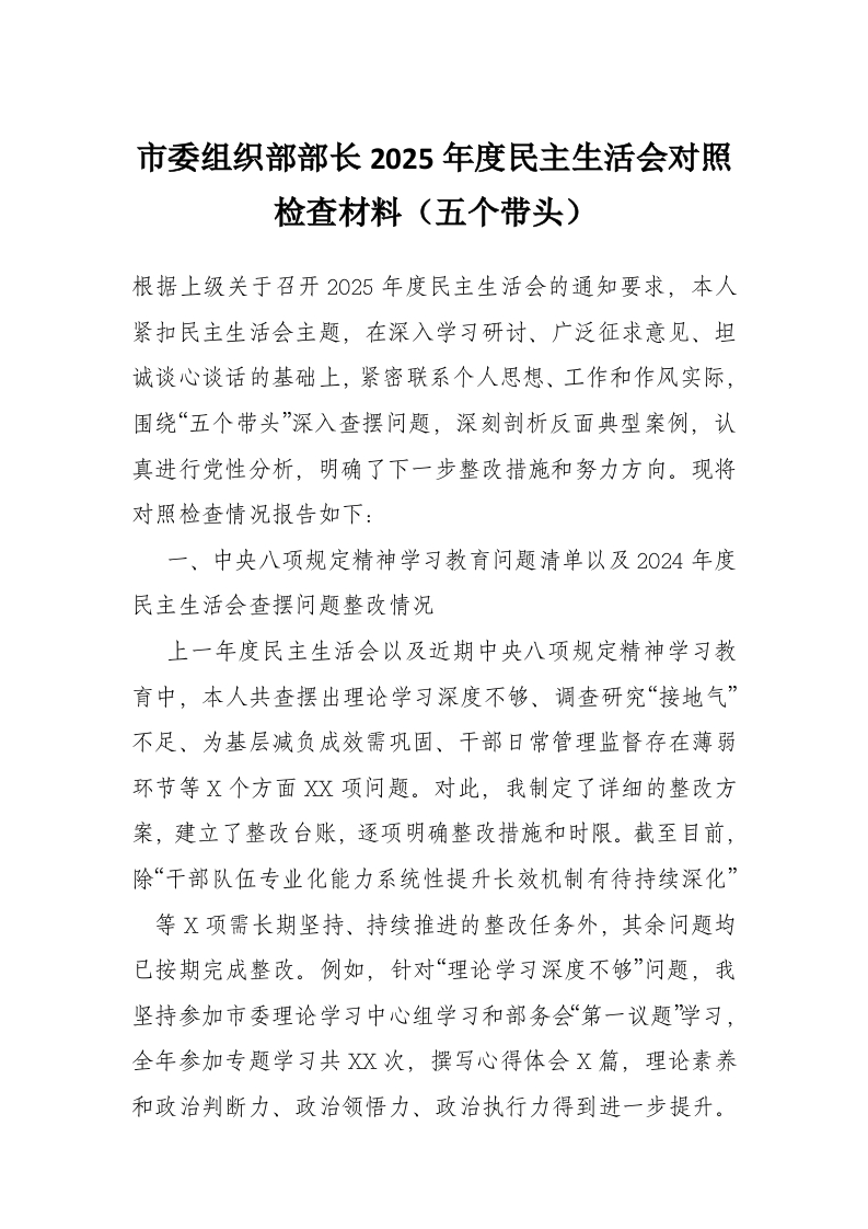 市委组织部部长2025年度民主生活会对照检查材料(五个带头)