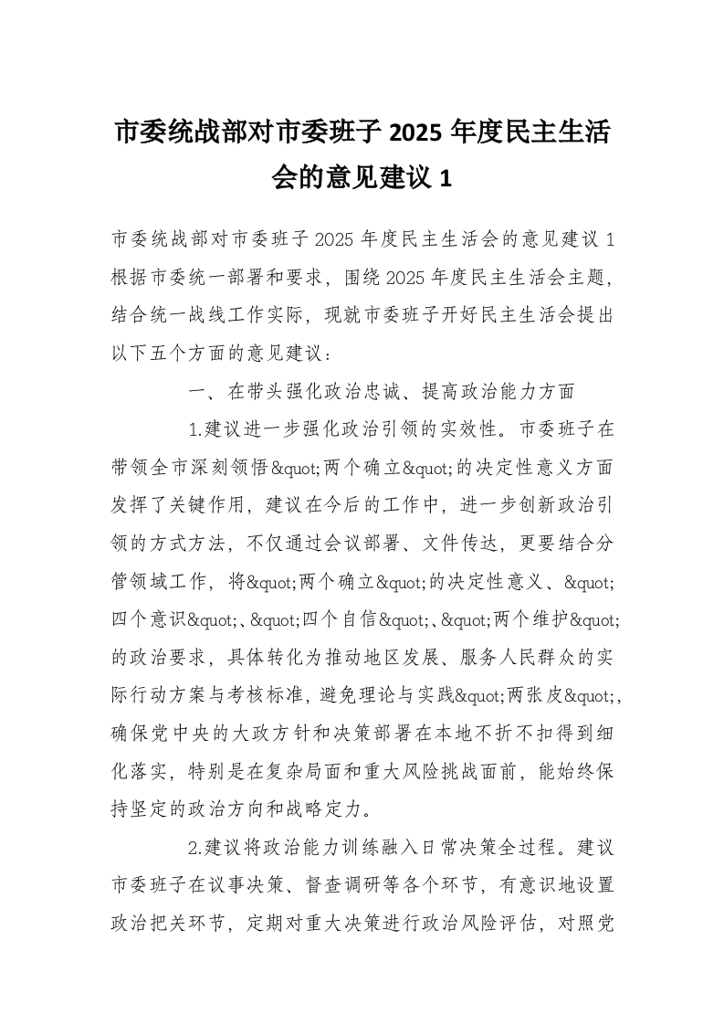 市委统战部对市委班子2025年度民主生活会的意见建议1