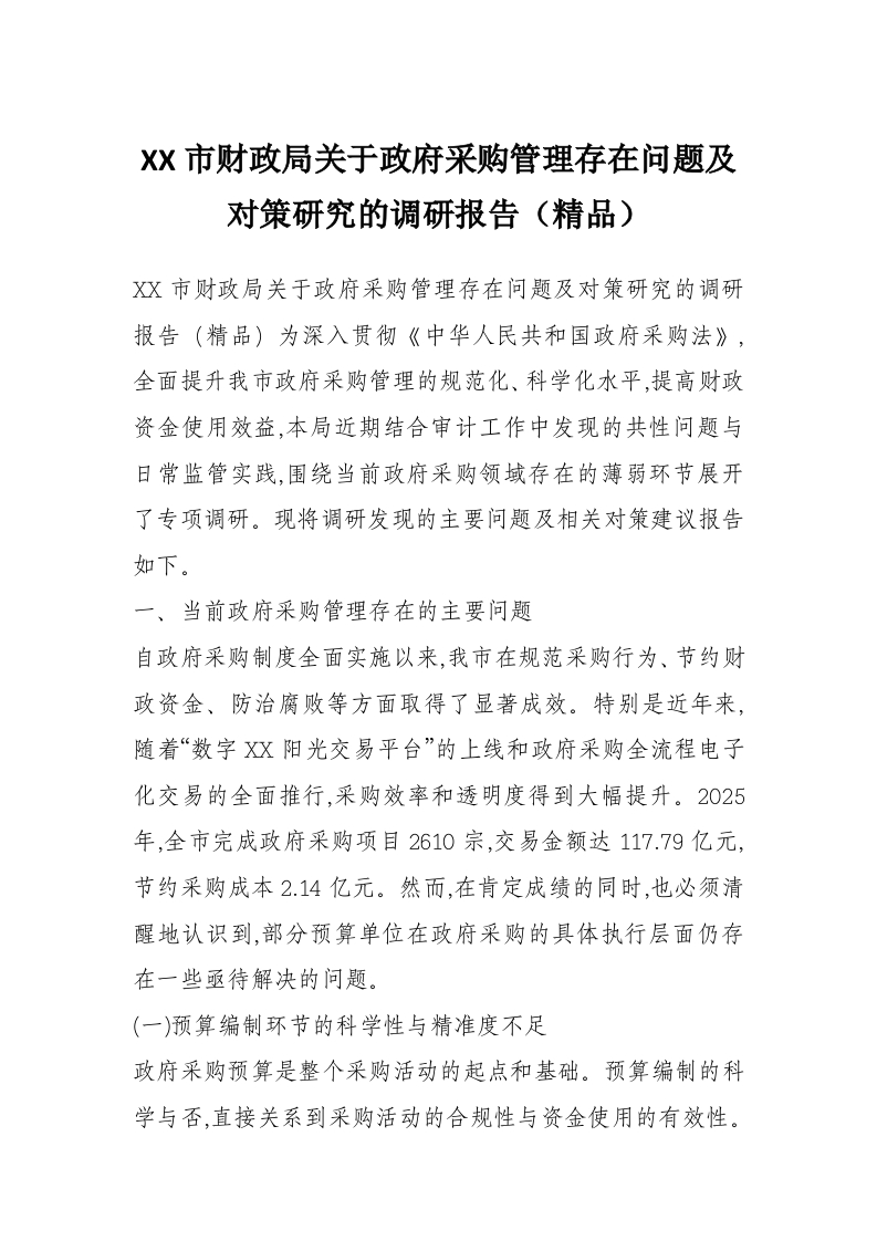 XX市财政局关于***采购管理存在问题及对策研究的调研报告(精品)