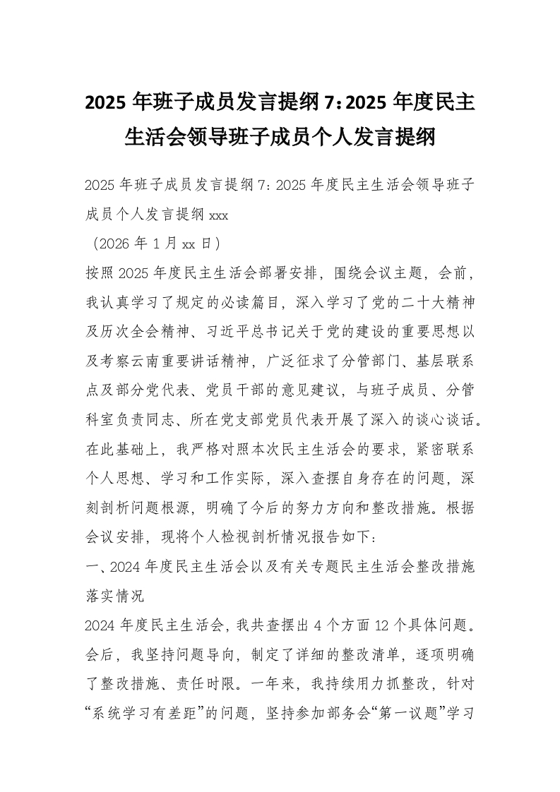 2025年班子成员发言提纲7:2025年度民主生活会领导班子成员个人发言提纲