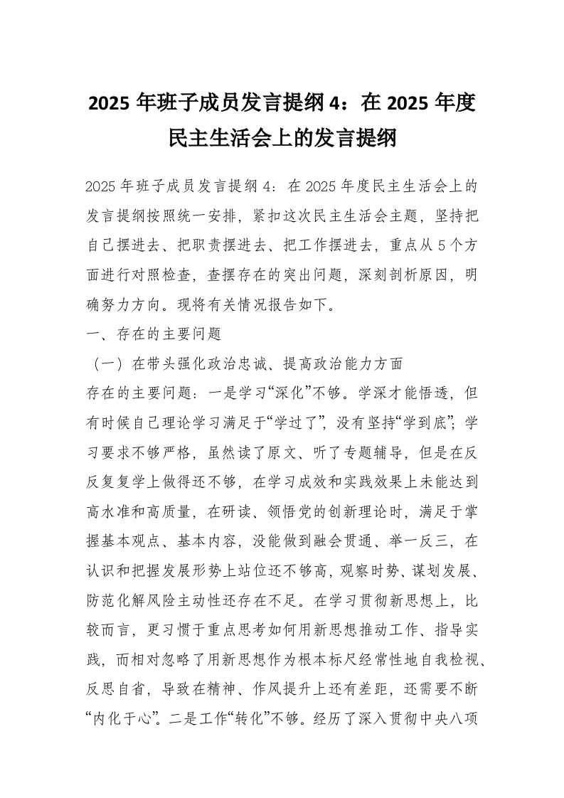 2025年班子成员发言提纲4:在2025年度民主生活会上的发言提纲
