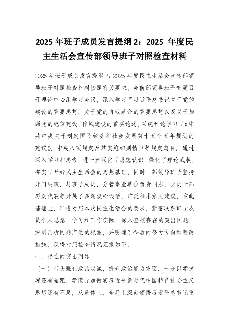 2025年班子成员发言提纲2:2025 年度民主生活会宣传部领导班子对照检查材料