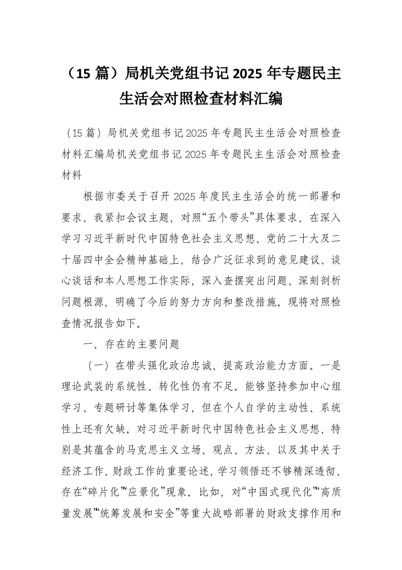 (15篇)局机关党组书记2025年专题民主生活会对照检查材料汇编