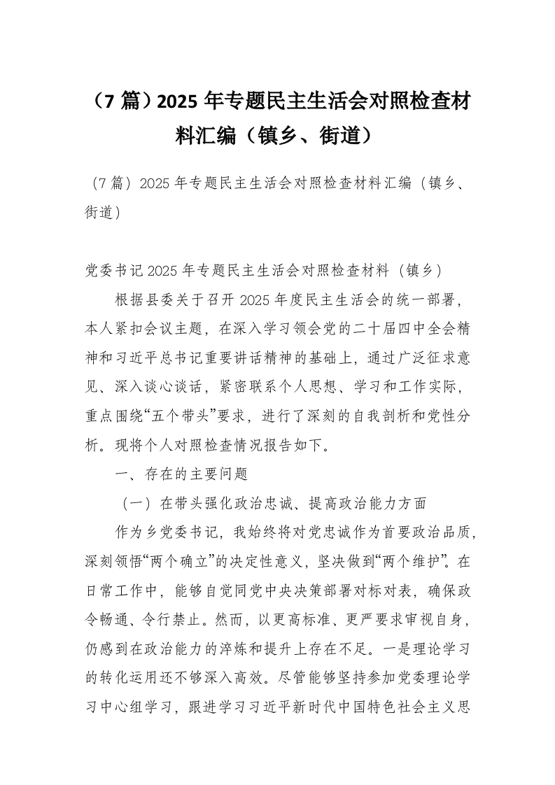 (7篇)2025年专题民主生活会对照检查材料汇编(镇乡、街道)