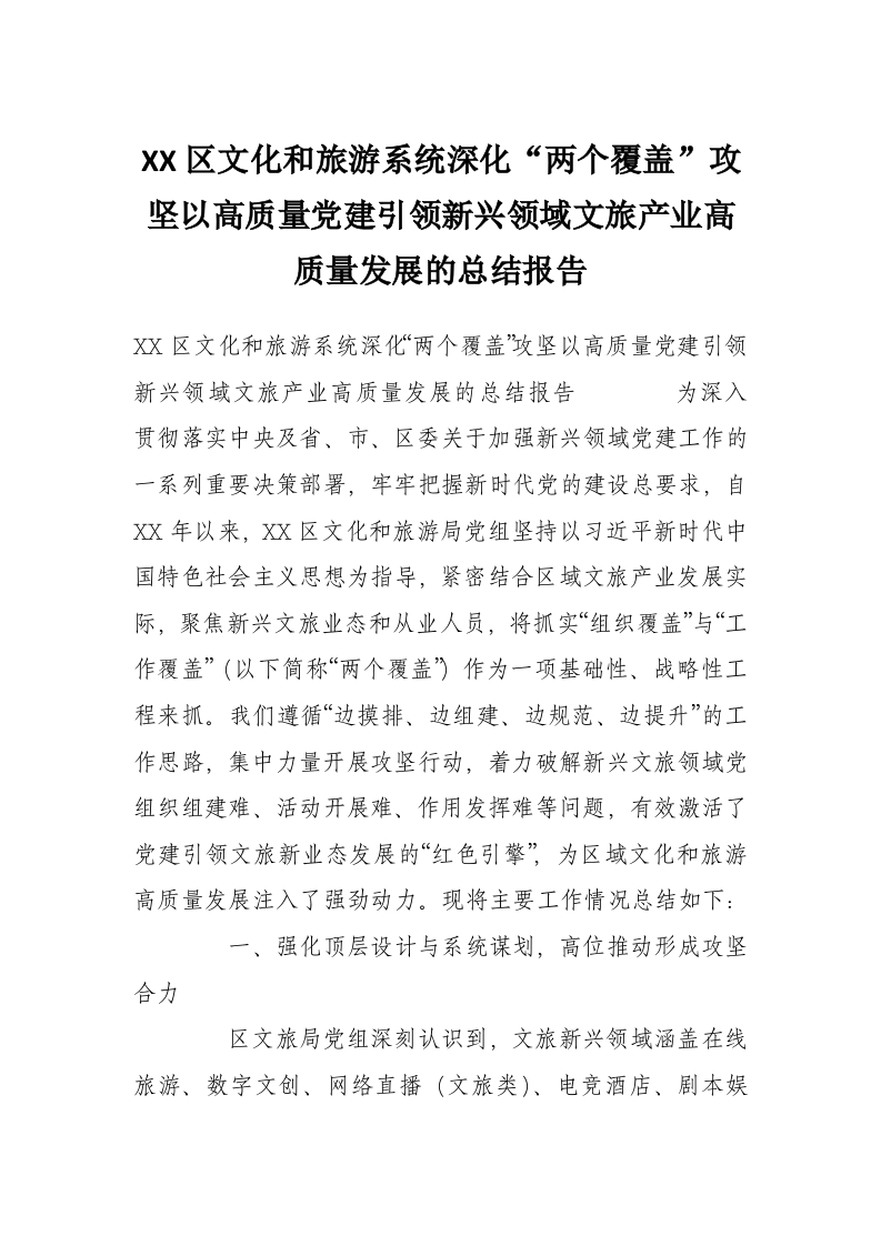 XX区文化和旅游系统深化“两个覆盖”攻坚以高质量党建引领新兴领域文旅产业高质量发展的总结报告