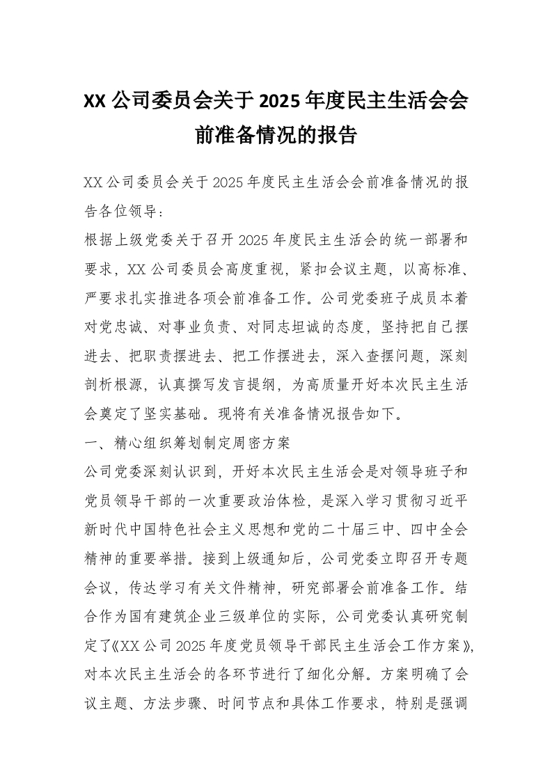XX公司委员会关于2025年度民主生活会会前准备情况的报告