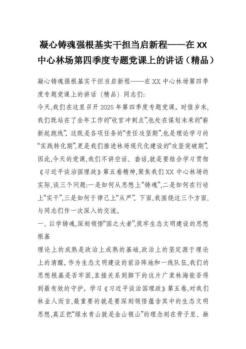凝心铸魂强根基实干担当启新程——在XX中心林场第四季度专题党课上的讲话(精品)