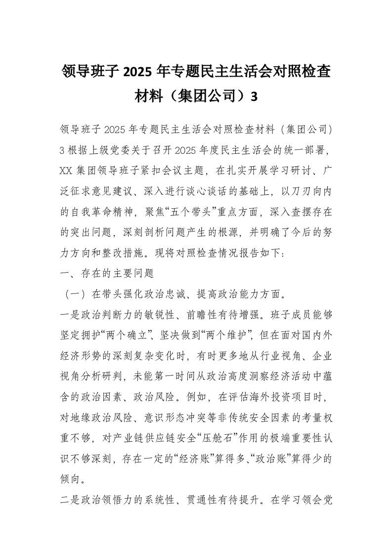 领导班子2025年专题民主生活会对照检查材料(集团公司)3