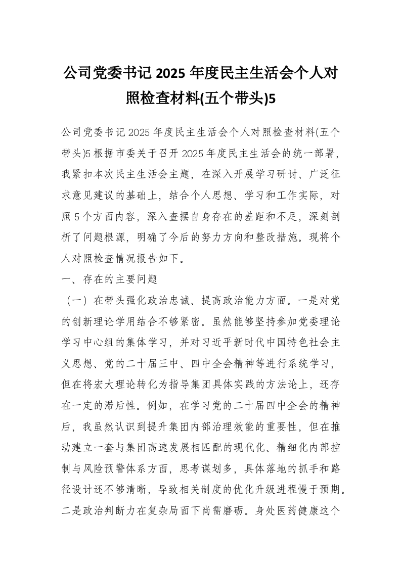首页工作文档公司党委书记2025年度民主生活会个人对照检查材料(五个带头)5