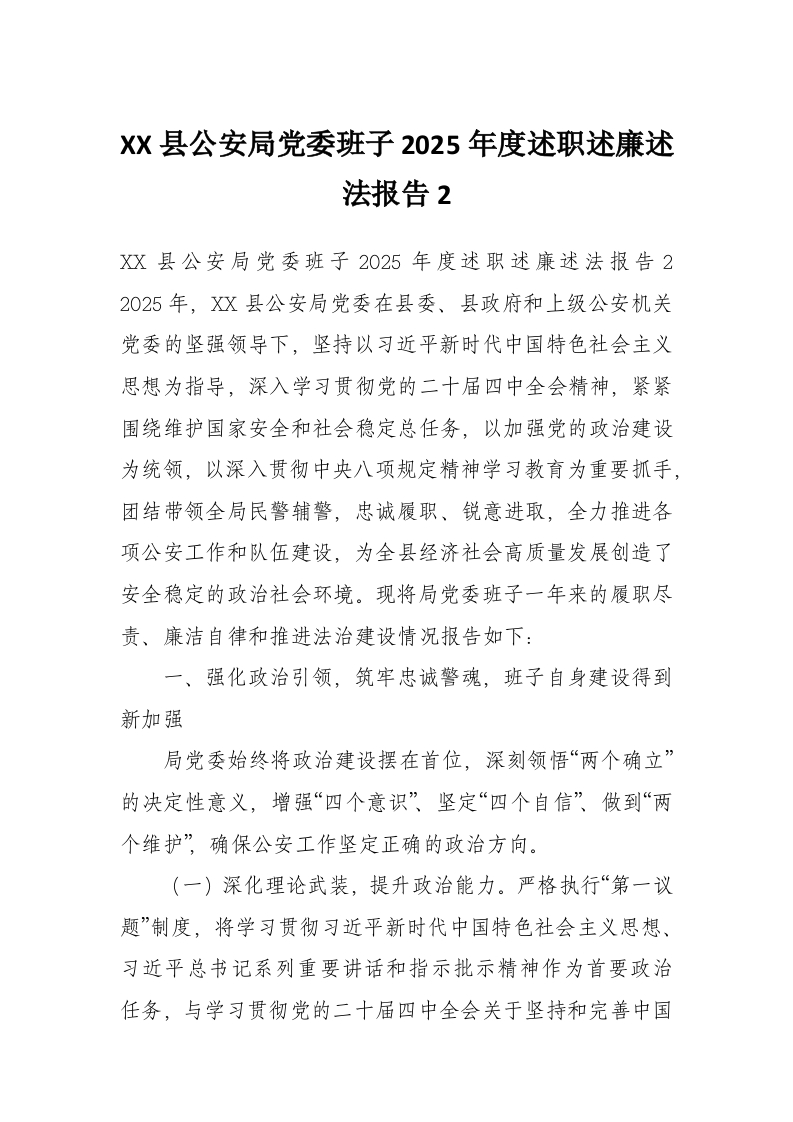 XX县公安局党委班子2025年度述职述廉述法报告2