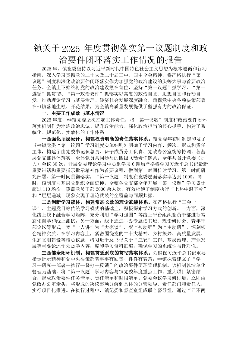 镇关于2025年度贯彻落实第一议题制度和政治要件闭环落实工作情况的报告