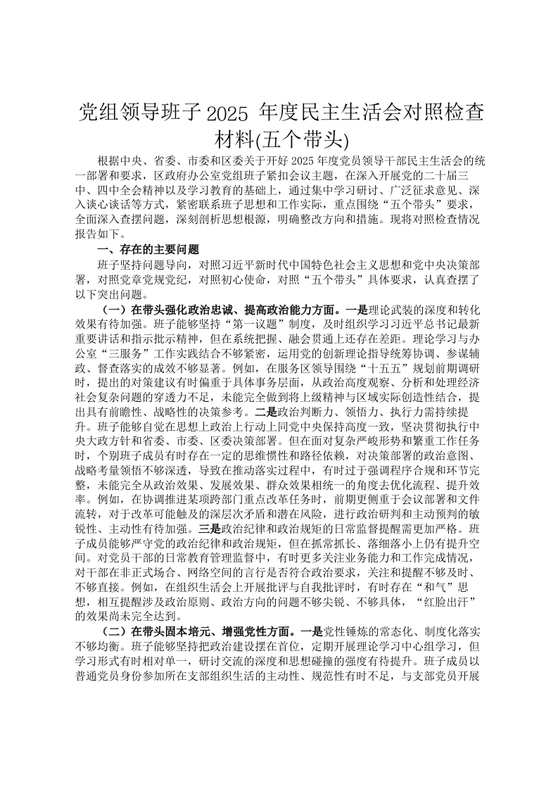 党组领导班子2025年度民主生活会对照检查材料(五个带头)