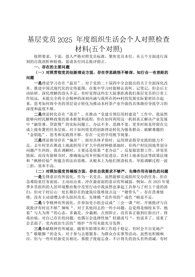 首页材料汇编基层党员2025年度组织生活会个人对照检查材料(五个对照)