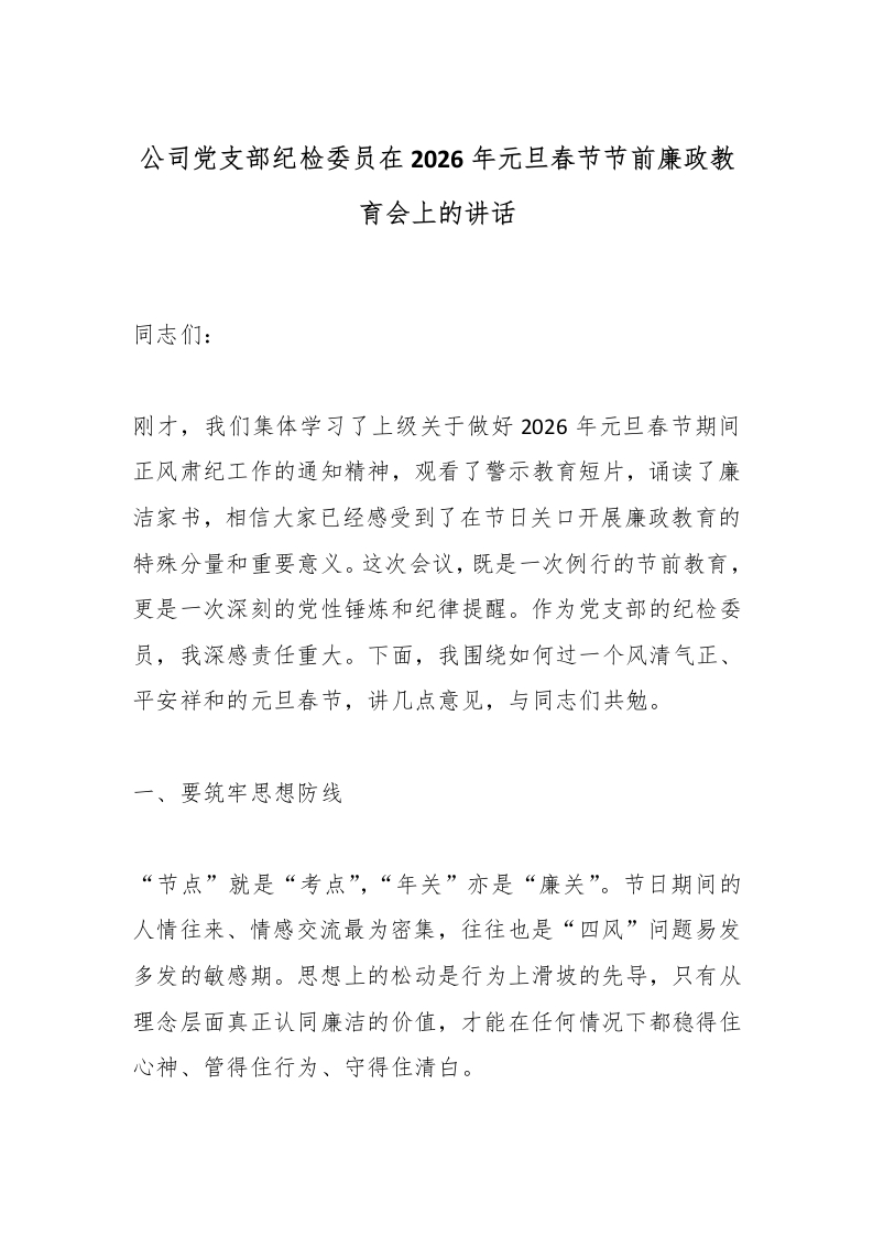 首页工作文档公司党支部纪检委员在2026年元旦春节节前廉政教育会上的讲话_副本