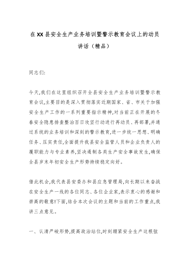 在XX县安全生产业务培训暨警示教育会议上的动员讲话(精品)_副本