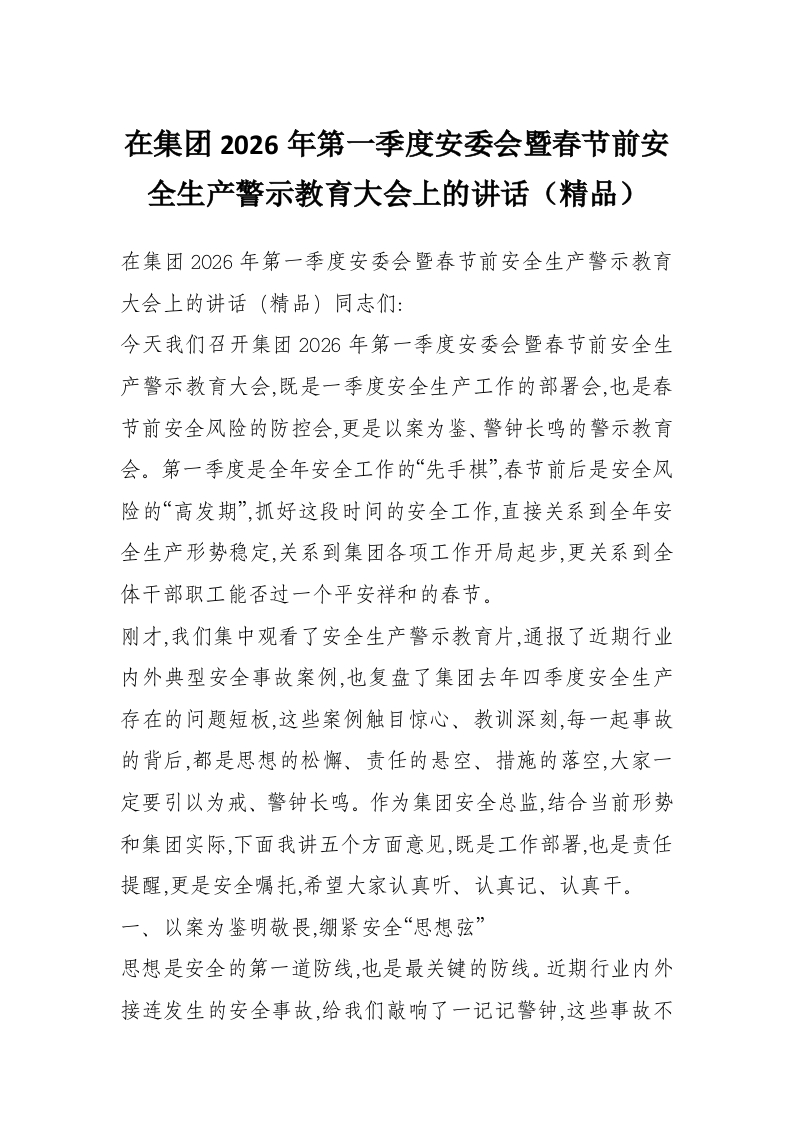 首页学习提升在集团2026年第一季度安委会暨春节前安全生产警示教育大会上的讲话(精品)