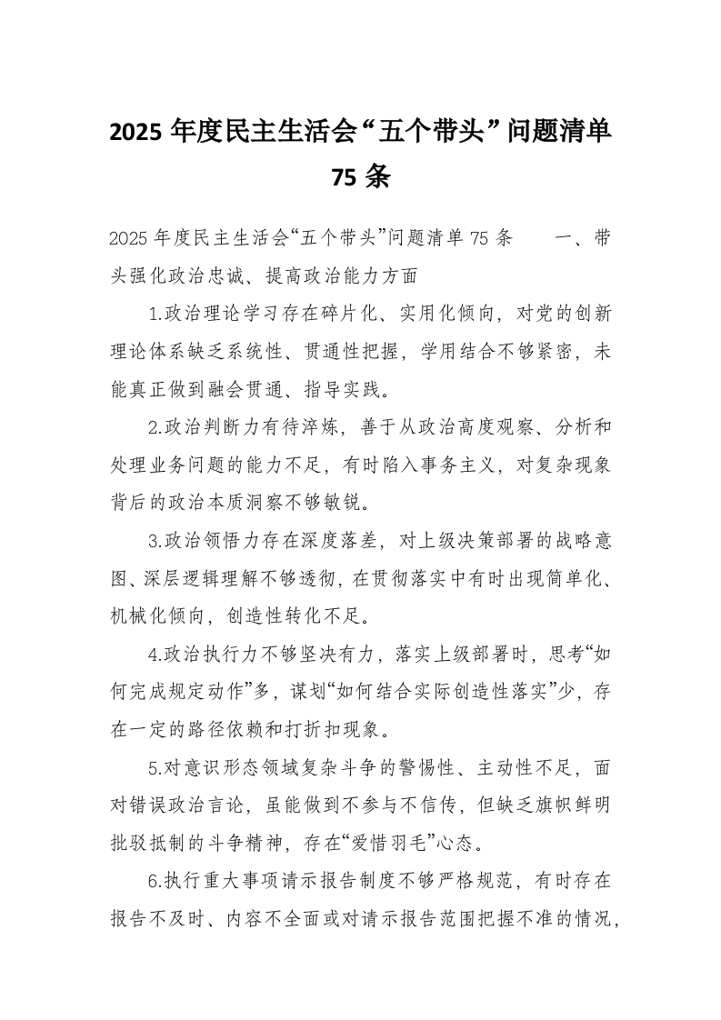 2025年度民主生活会“五个带头”问题清单75条
