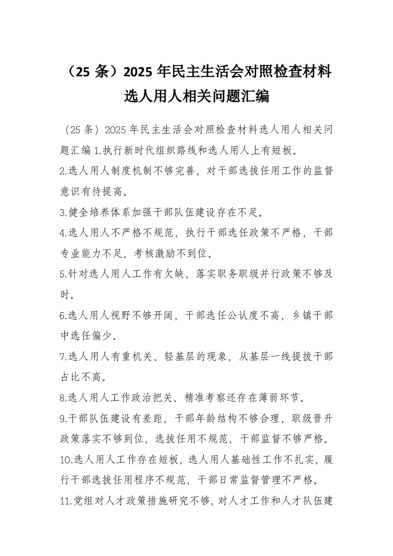 首页材料汇编(25条)2025年民主生活会对照检查材料选人用人相关问题汇编