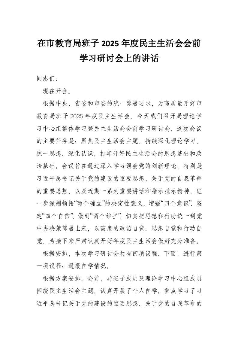 在市教育局班子2025年度民主生活会会前学习研讨会上的讲话