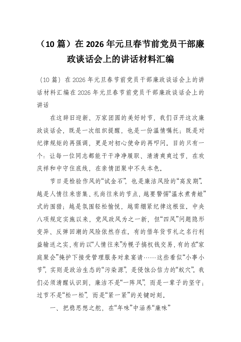 (10篇)在2026年元旦春节前党员干部廉政谈话会上的讲话材料汇编