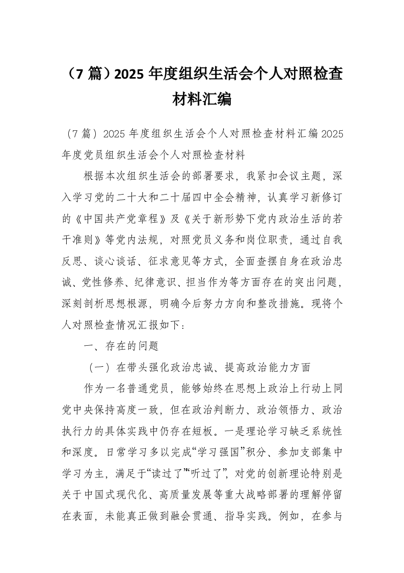 (7篇)2025年度组织生活会个人对照检查材料汇编