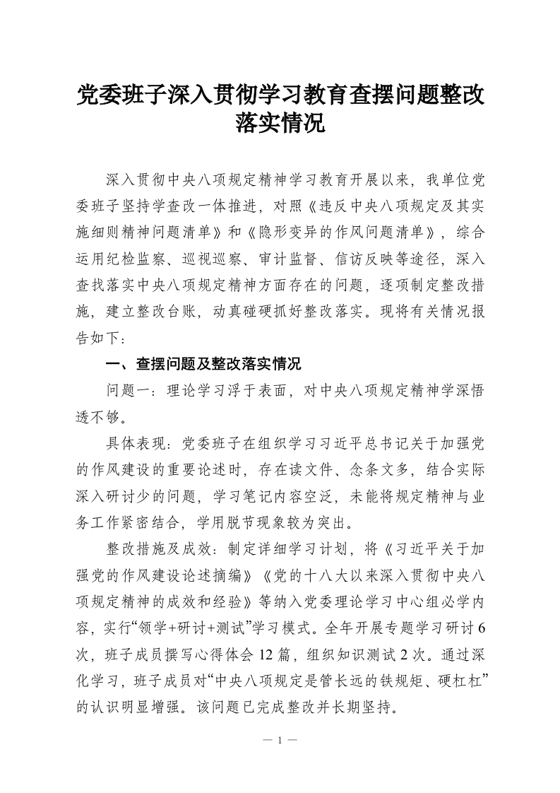 党委班子深入贯彻学习教育查摆问题整改落实情况