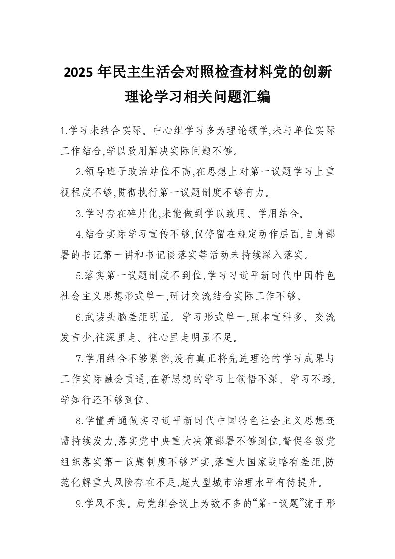 2025年民主生活会对照检查材料党的创新理论学习相关问题汇编