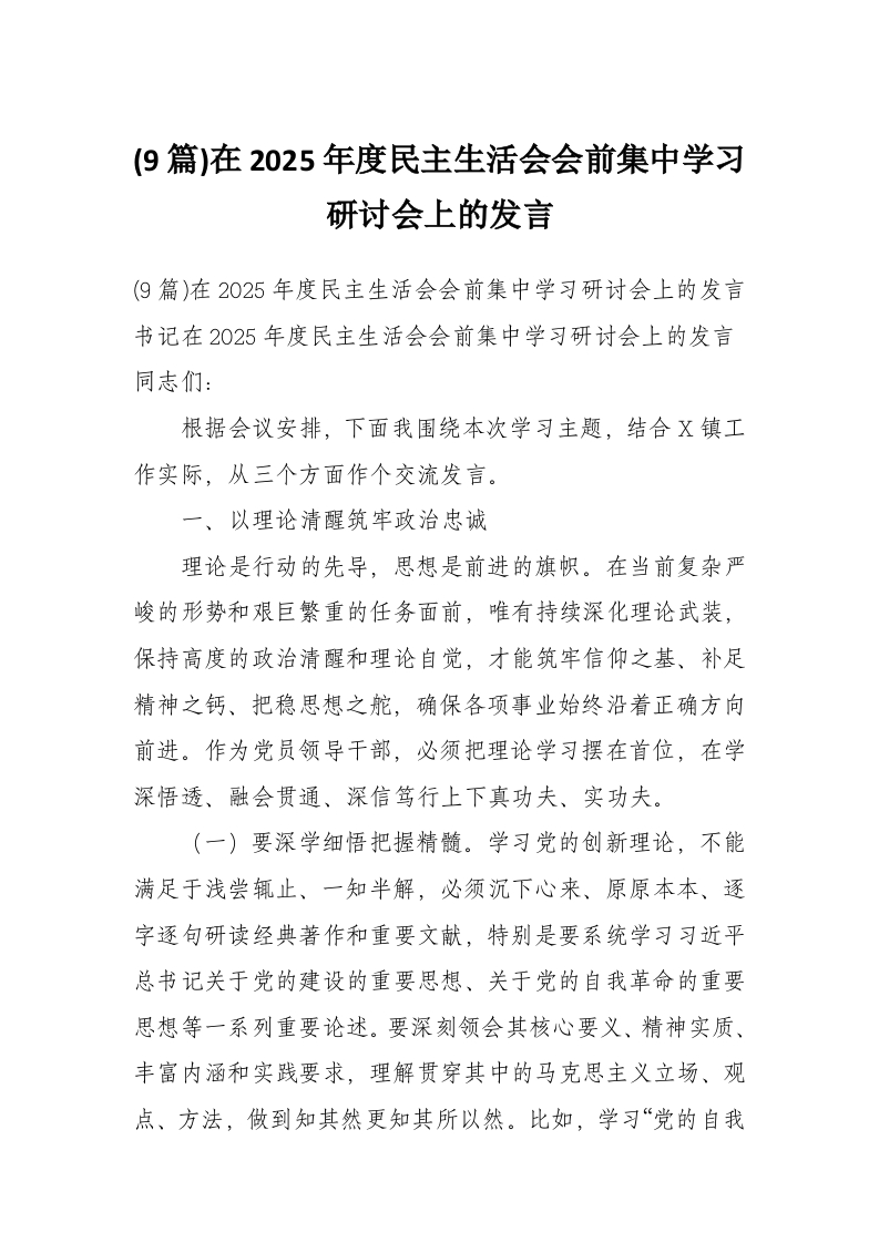 (9篇)在2025年度民主生活会会前集中学习研讨会上的发言