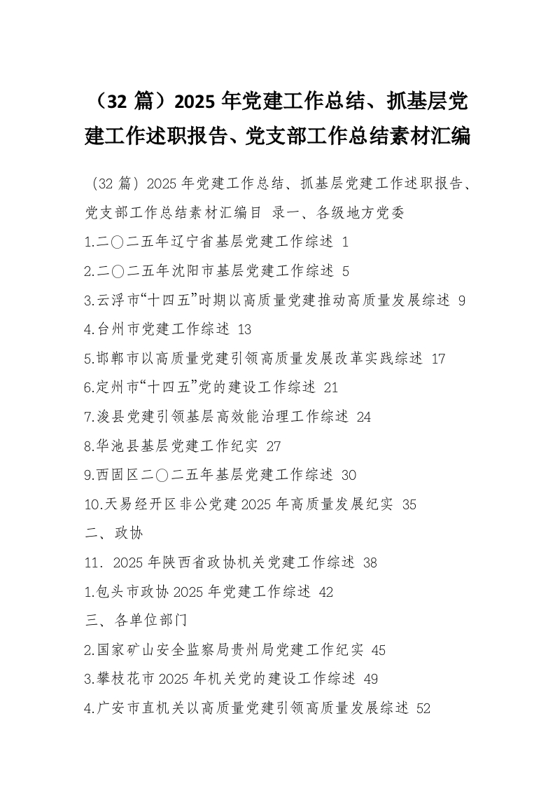 首页材料汇编(32篇)2025年党建工作总结、抓基层党建工作述职报告、党支部工作总结素材汇编