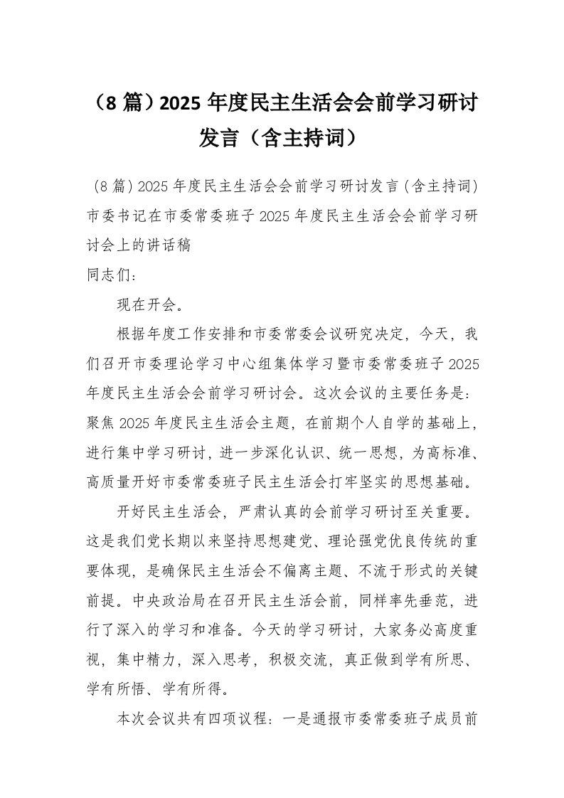 (8篇)2025年度民主生活会会前学习研讨发言(含主持词)