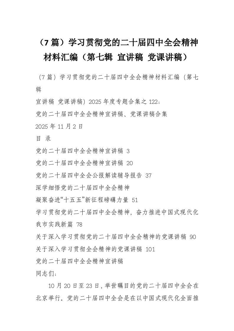(7篇)学习贯彻党的二十届四中***精神材料汇编(第七辑 宣讲稿 党课讲稿)